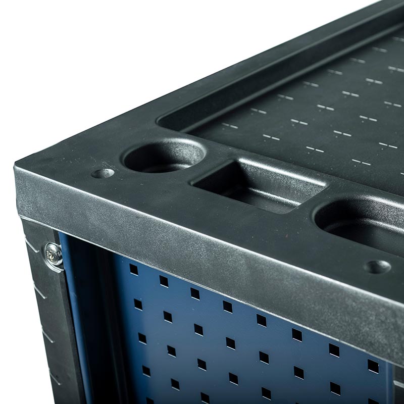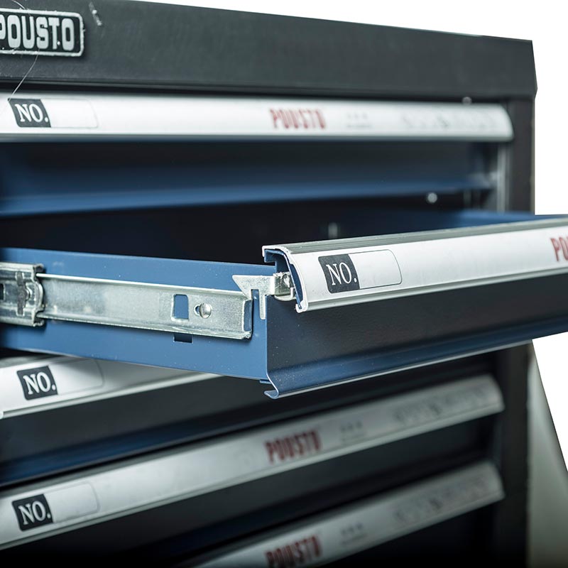 1.抽屜采用滾珠導軌,抽屜承重力為50kg/層,六層抽屜不同高度能儲存不同種類的工具,中央側鎖設計,開啟方便,每個抽屜都配有防傾倒保護鎖。