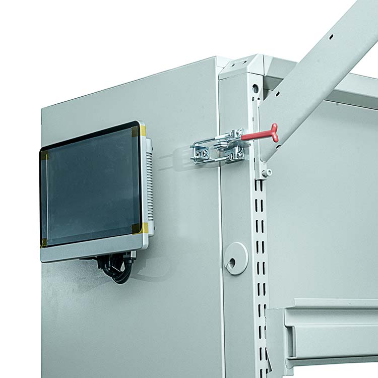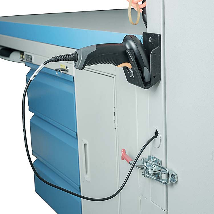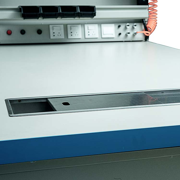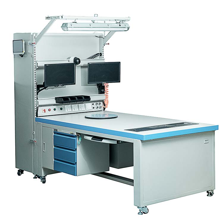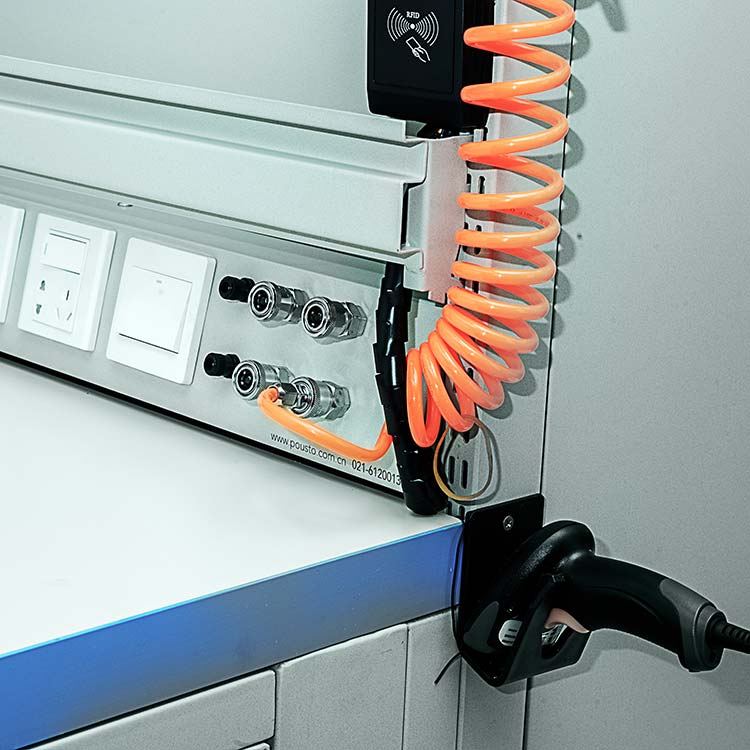 多功能工作臺具有掃碼,監控攝像,報警,讀卡器,氣吹槍,顯示屏等功能,并帶有隱藏式電控箱獨立供電