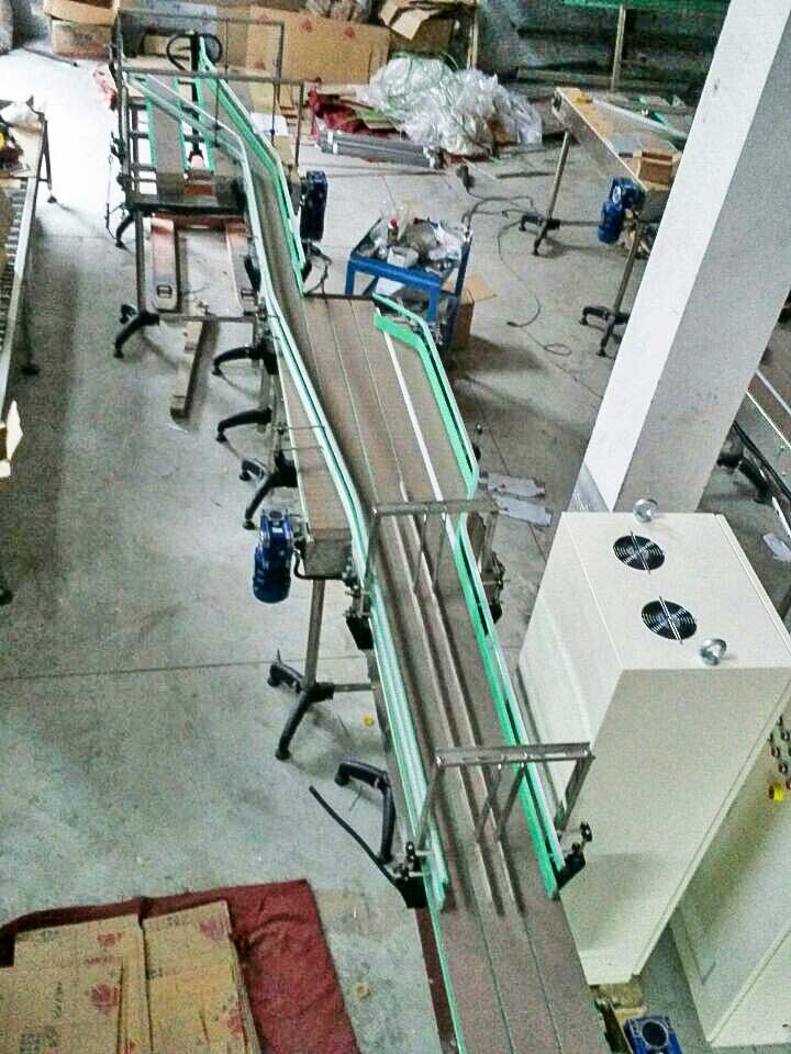 板鏈線由鏈條牽引,承重的鋼板、塑膠板等固定于輸送機兩側導軌內的鏈條上,作為承重機構,和生產線同步運行,可以實現產品的爬坡,可以實現生產的平穩愉送。