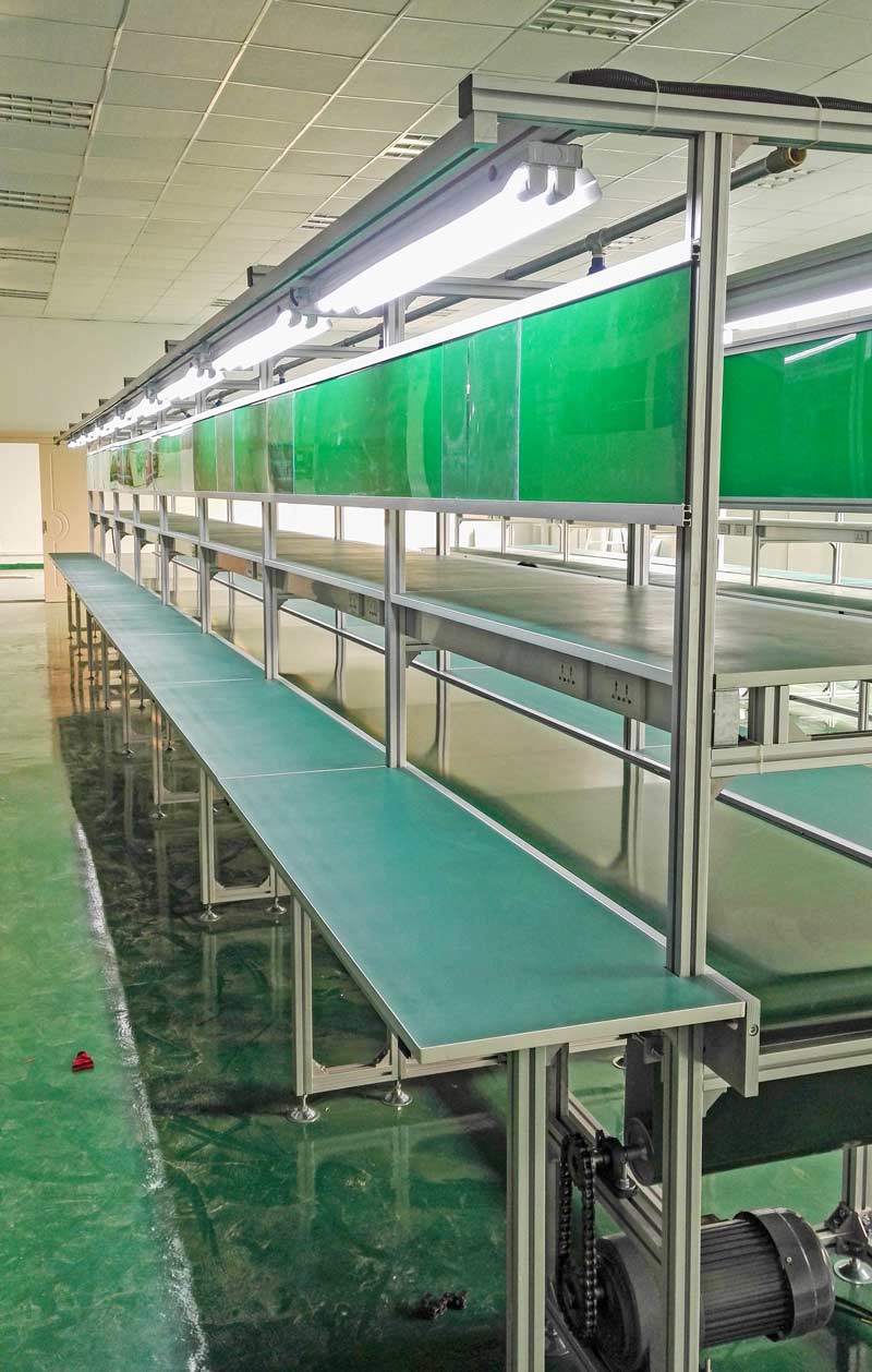 以皮帶為輸送材料的工業流水線,皮帶輸送線在電子產品裝配行業應用的最為廣泛,可以滿足生產車間的防靜電需求。在生產中,具有運行平穩的特點