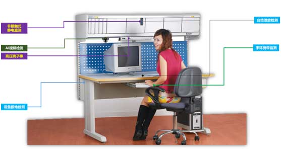 在線防靜電檢測(cè)系統(tǒng)包含方靜電設(shè)備(防靜電臺(tái)、雙回路手環(huán))、靜電安全接地系統(tǒng),光電檢測(cè)系統(tǒng)、在線監(jiān)測(cè)儀以及看板系統(tǒng)、聲光報(bào)警等設(shè)備與軟件組成,通過有線或無線網(wǎng)絡(luò),將前后臺(tái)連接起來,實(shí)現(xiàn)真正意義上的實(shí)時(shí)監(jiān)控、數(shù)據(jù)儲(chǔ)存、以及動(dòng)態(tài)顯示等功能,從而解決以往靜電防護(hù)過程記錄空缺、監(jiān)管難問題。通過結(jié)構(gòu)化的設(shè)計(jì)將相關(guān)的電子檢測(cè)設(shè)備和設(shè)備臺(tái)完整結(jié)合,達(dá)到美觀、整潔以及一體化的目標(biāo)。