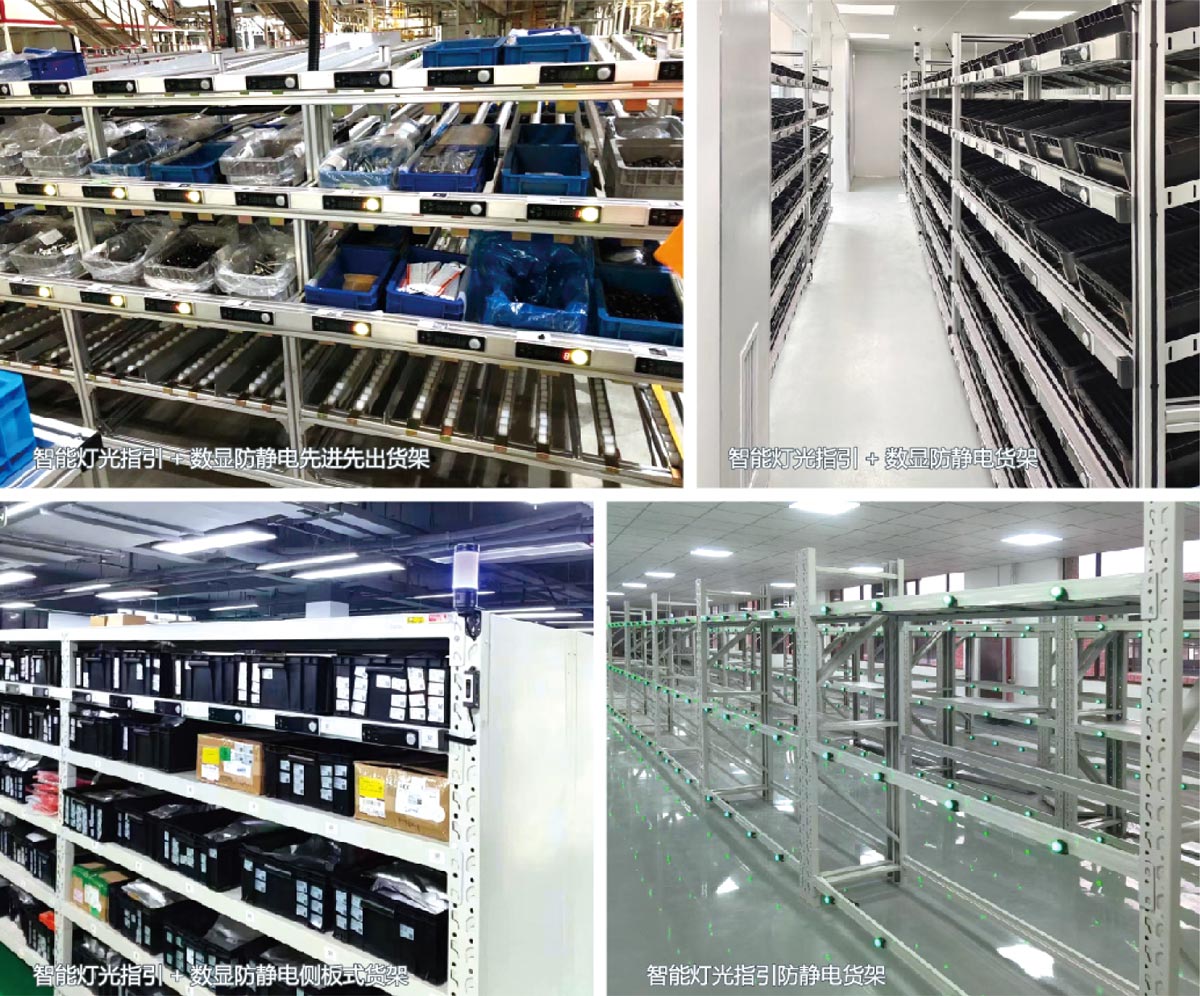 - 智能防靜電貨架通過數顯式和燈光指引系統能對貨架存放的物品進行簡便直觀的錄入,方便迅速的査詢,靈活的分類統計。