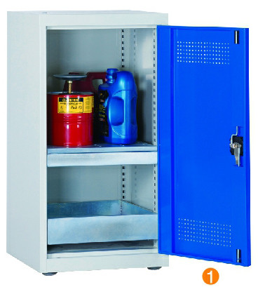 用于污染液體的存儲(chǔ),可調(diào)式隔板,上下25mm可調(diào) 可移動(dòng)式底部貯存盤高100mm,無(wú)縫焊接,更好防泄漏 門板的頂部及底部帶通風(fēng)孔,自然通風(fēng),門開啟角度12。 隔板/貯存盤式層板每層最大承重60KG (可抽出式除外) 柜體最大承重承重:300KG
